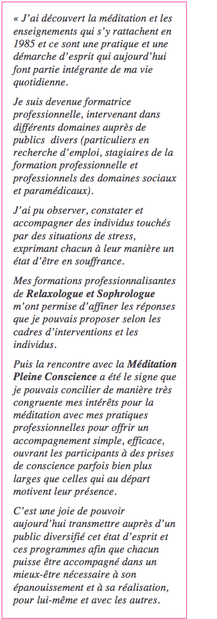L’enseignante de la Méditation Pleine Conscience selon le programme MBSR de Jon Kabat-Zinn est une professionnelle formée au programme, aux principes de base et aux outils de la Pleine Conscience.